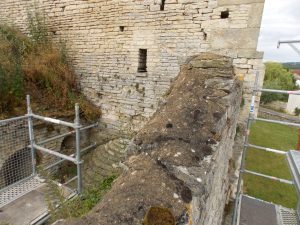 Il s’agit de dégager le haut du mur de sa gangue de ciment et de végétation, et de refaire un enduit à la chaux.
