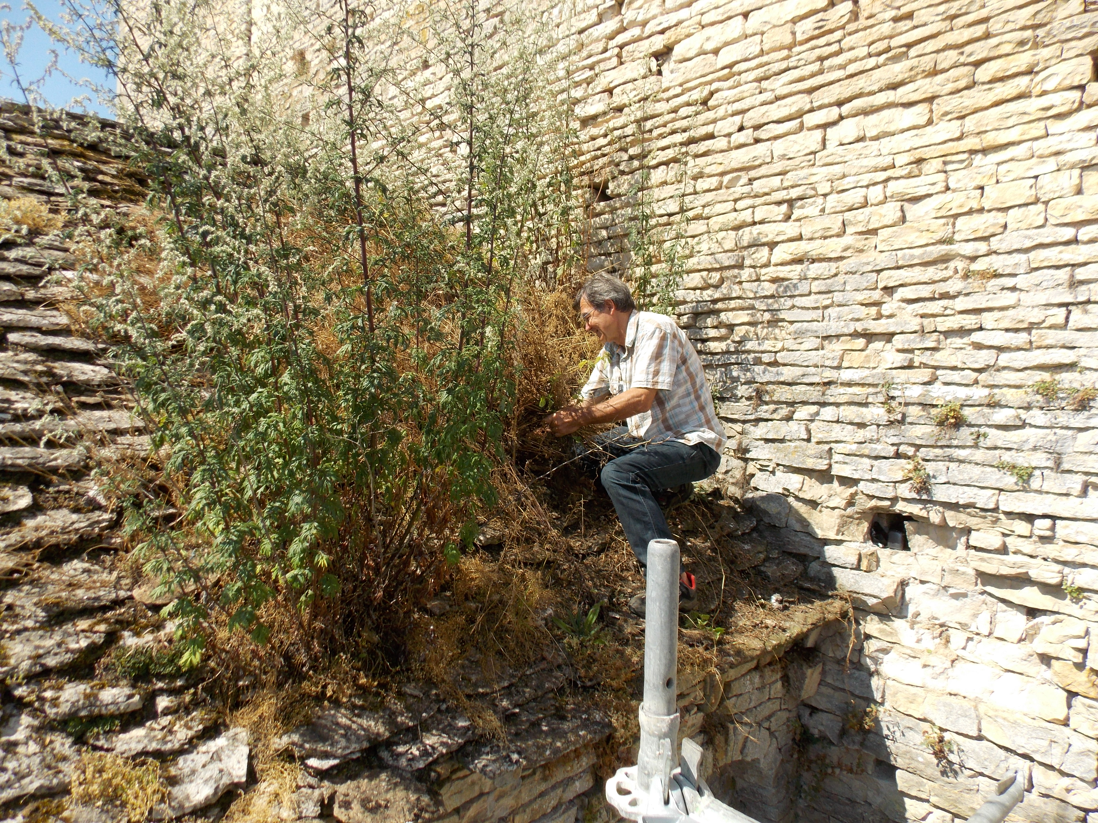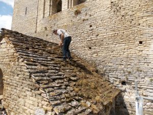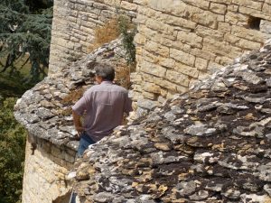 Pendant ce temps (mais en dehors du ‘chantier’) Yves profite de l’échafaudage accéder aux toitures et enlever la végétation qui envahit les toitures en laves :